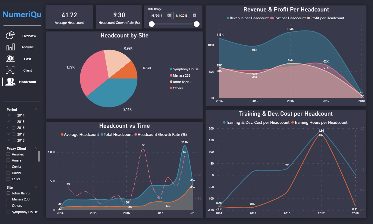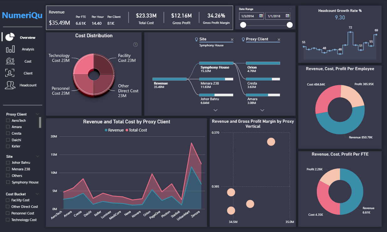 Comprehensive tracking of revenue, expenses, gross margin, and profitability across departments and business units.